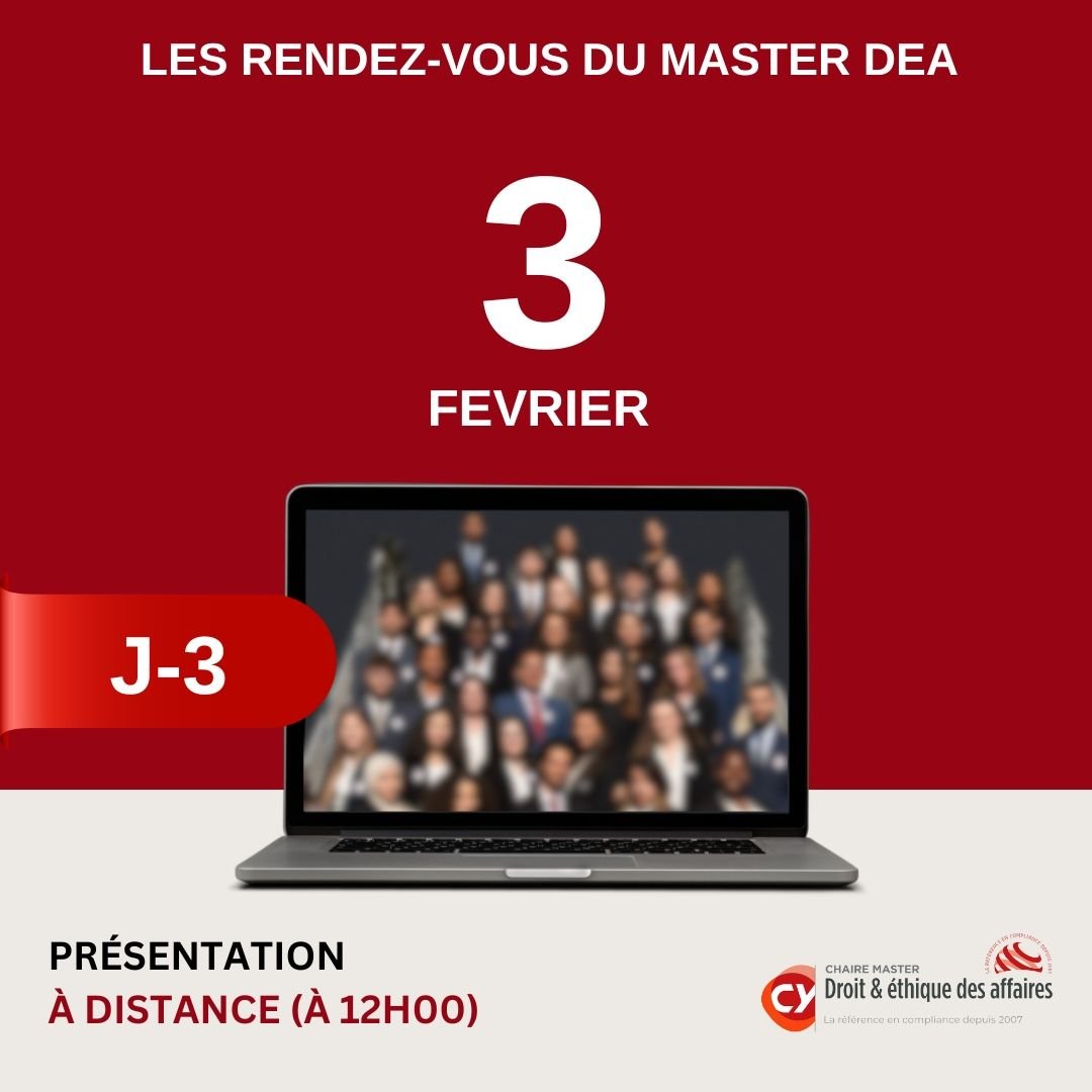 Inscrivez vous dès maintenant, il ne reste que quelques jours pour être en mesure d'assister à notre présentation à distance du Master Droit et Ethique des Affaires, prévue le samedi 3 février 2024 à midi.
